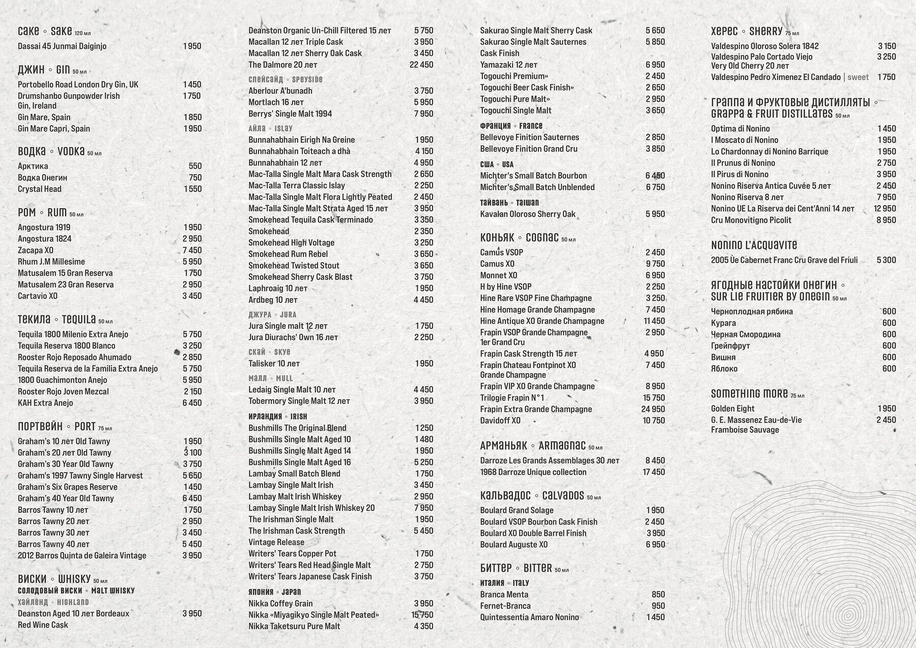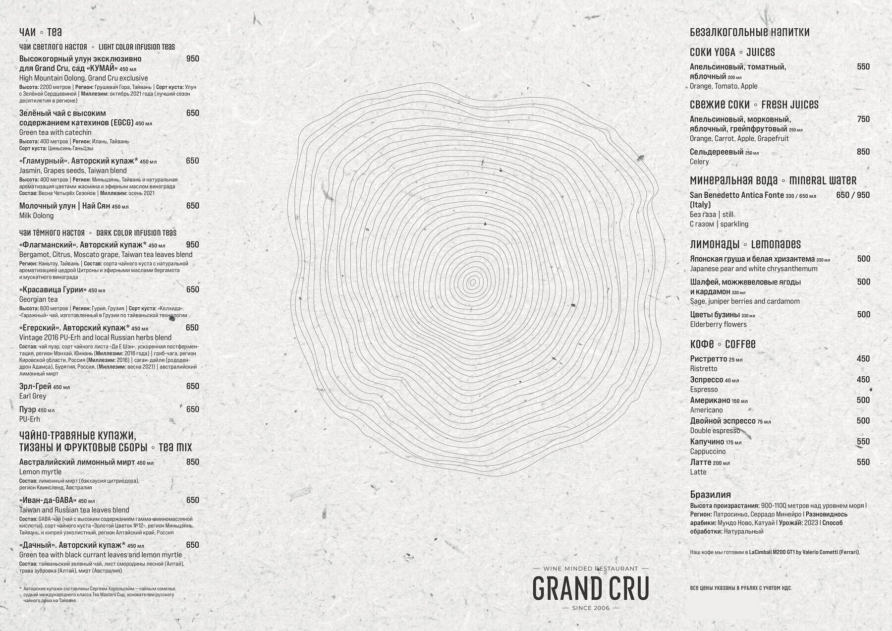 История ресторана Grand Cru насчитывает уже более пятнадцати лет. За это время пространство изменилось, стало более ярким и креативным, но неизменным осталось утончённое чувство стиля и изящный минимализм. Удобные диваны и кресла графитовых оттенков, элегантно сервированные столики, мягкое освещение, спокойная музыка. Атмосфера располагает к приятному отдыху, неторопливым разговорам и дегустации напитков.